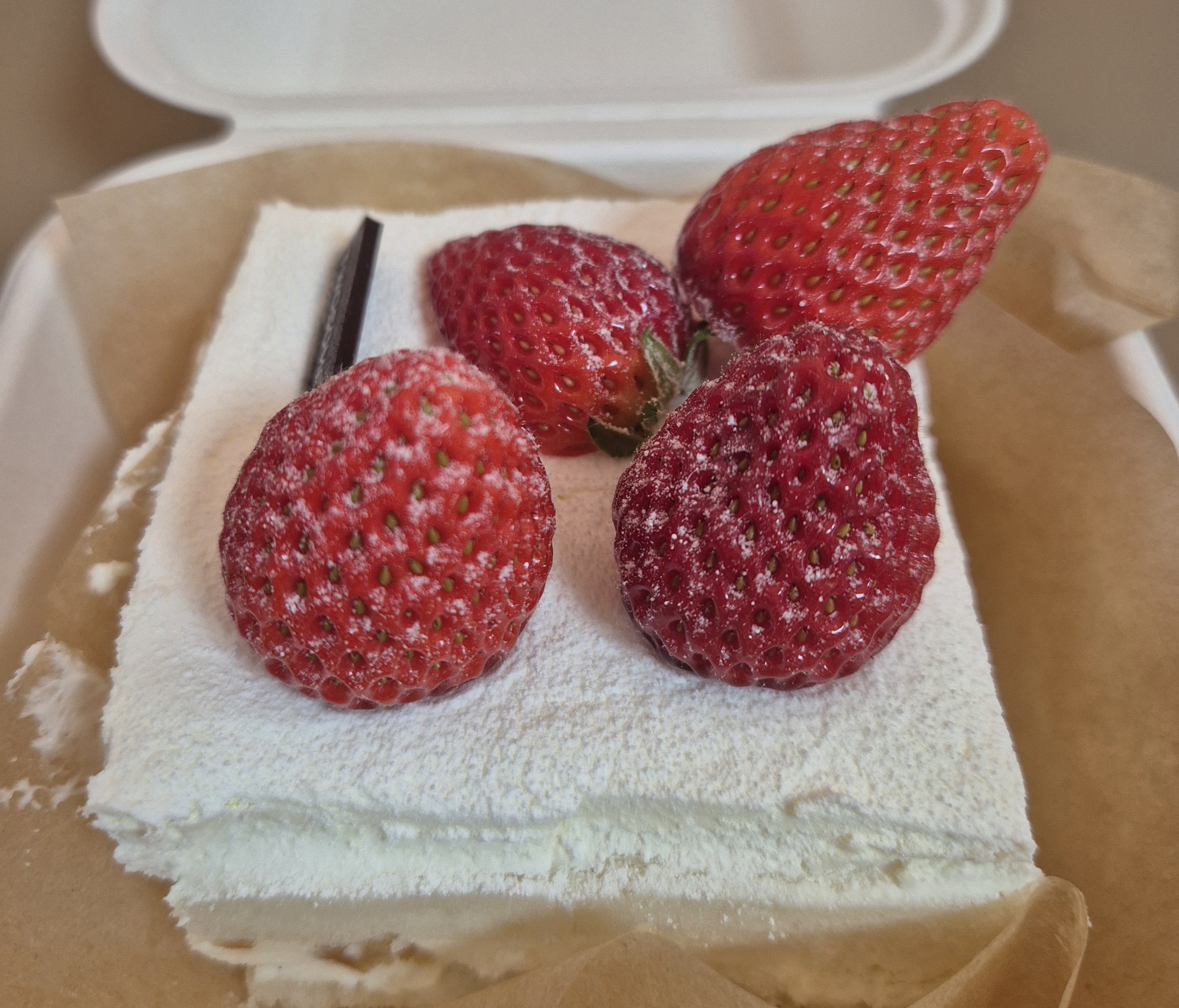 케이크는 보자마자 눈에 띄는 새하얀 크림 위에 선명한 빨간 딸기가 올라가 있어서 비주얼적으로는 정말 예뻤어요.